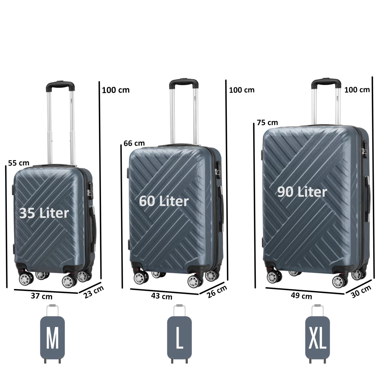 Das 3-teilige Koffer Set mit verschiedenen Größen ist das perfekte Set für jede Reise. Egal ob für eine Fernreise (Größe XL), eine Bahn-/Autoreise (Größe L) oder einen Wochenendtrip mit Handgepäck (Größe M), für jede Gelegenheit den passenden Koffer! Außerdem lassen sich die Koffer ineinander aufbewahren und können so platzsparend gelagert werden.
