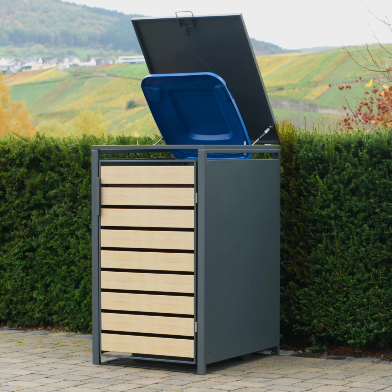 Unser Zelsius Mülltonnenkasten bietet Platz für eine 120 – 240 Liter Tonne und wertet nebenbei durch das ansprechende Design Ihre Hauseinfahrt optisch auf. Die Vorderseite der Tür glänzt in einem ansprechenden Holzdesign.