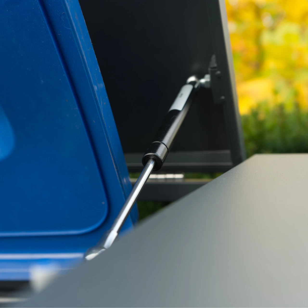 An den Fronttüren der Box befindet sich ein 19,5 cm großer Griff, der das Öffnen und Schließen der Tür erleichtert. Zusätzlich befindet sich im Lieferumfang eine Schnur, mit der Sie den Deckel Ihrer Mülltonne einfach an dem Deckel der Müllbox befestigen können. Dadurch werden beim Öffnen automatisch beide Deckel zusammen geöffnet.