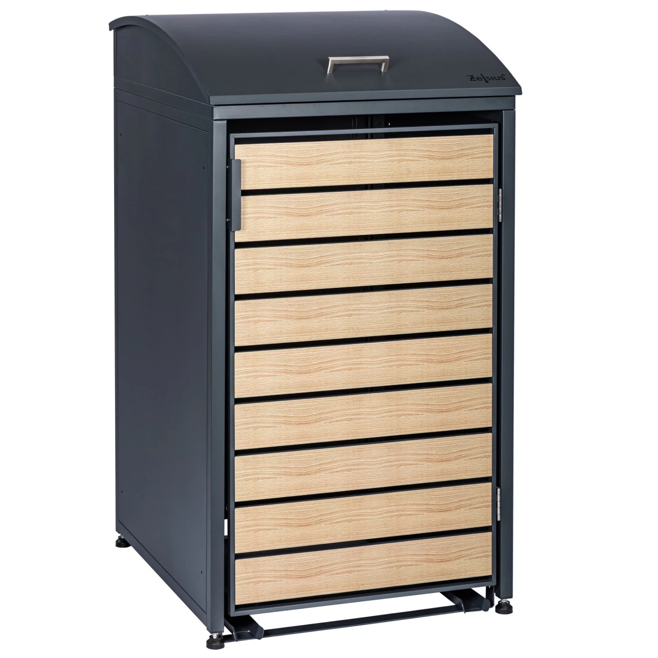 Unser Zelsius Mülltonnenkasten bietet Platz für eine 120 – 240 Liter Tonne und wertet nebenbei durch das ansprechende Design Ihre Hauseinfahrt optisch auf. Die Vorderseite der Tür glänzen in einem ansprechenden Holzdesign.