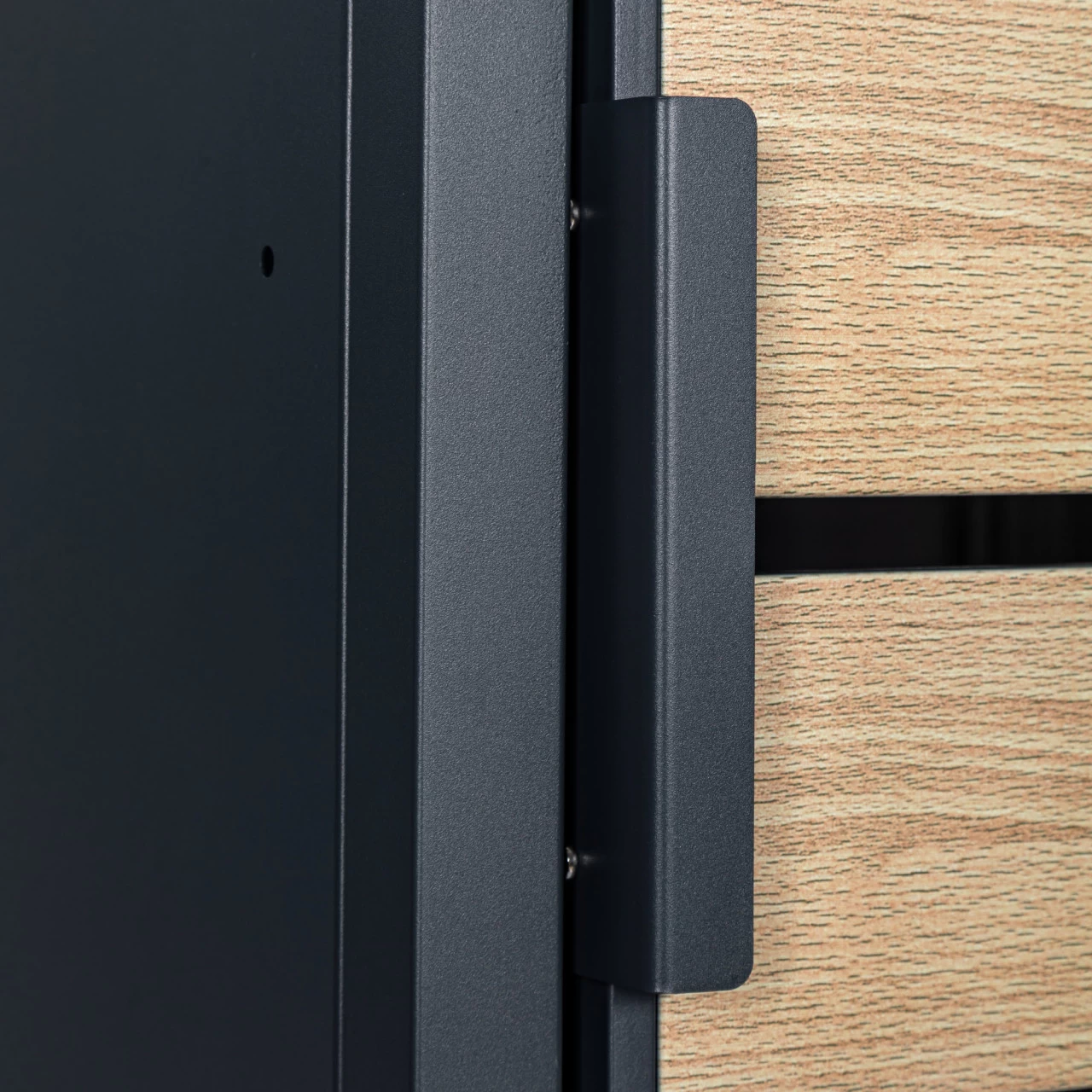 An den Fronttüren der Box befindet sich ein 16 cm großer Griff, der das Öffnen und Schließen der Tür erleichtert. Zusätzlich befindet sich im Lieferumfang eine Schnur, mit der Sie den Deckel Ihrer Mülltonne einfach an dem Deckel der Müllbox befestigen können. Dadurch werden beim Öffnen automatisch beide Deckel zusammen geöffnet.