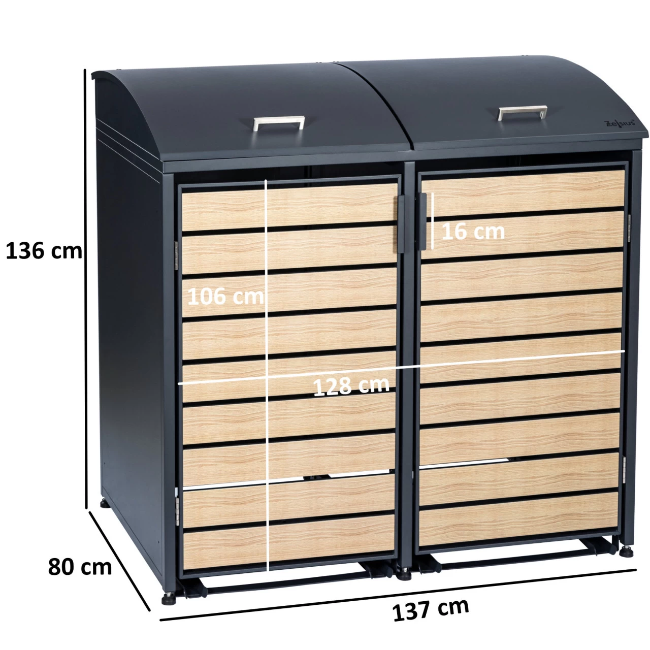 Unser Zelsius Mülltonnenkasten bietet Platz für zwei 120 – 240 Liter Tonnen und wertet nebenbei durch das ansprechende Design Ihre Hauseinfahrt optisch auf. Die Vorderseite der Türen glänzen in einem ansprechenden Holzdesign.