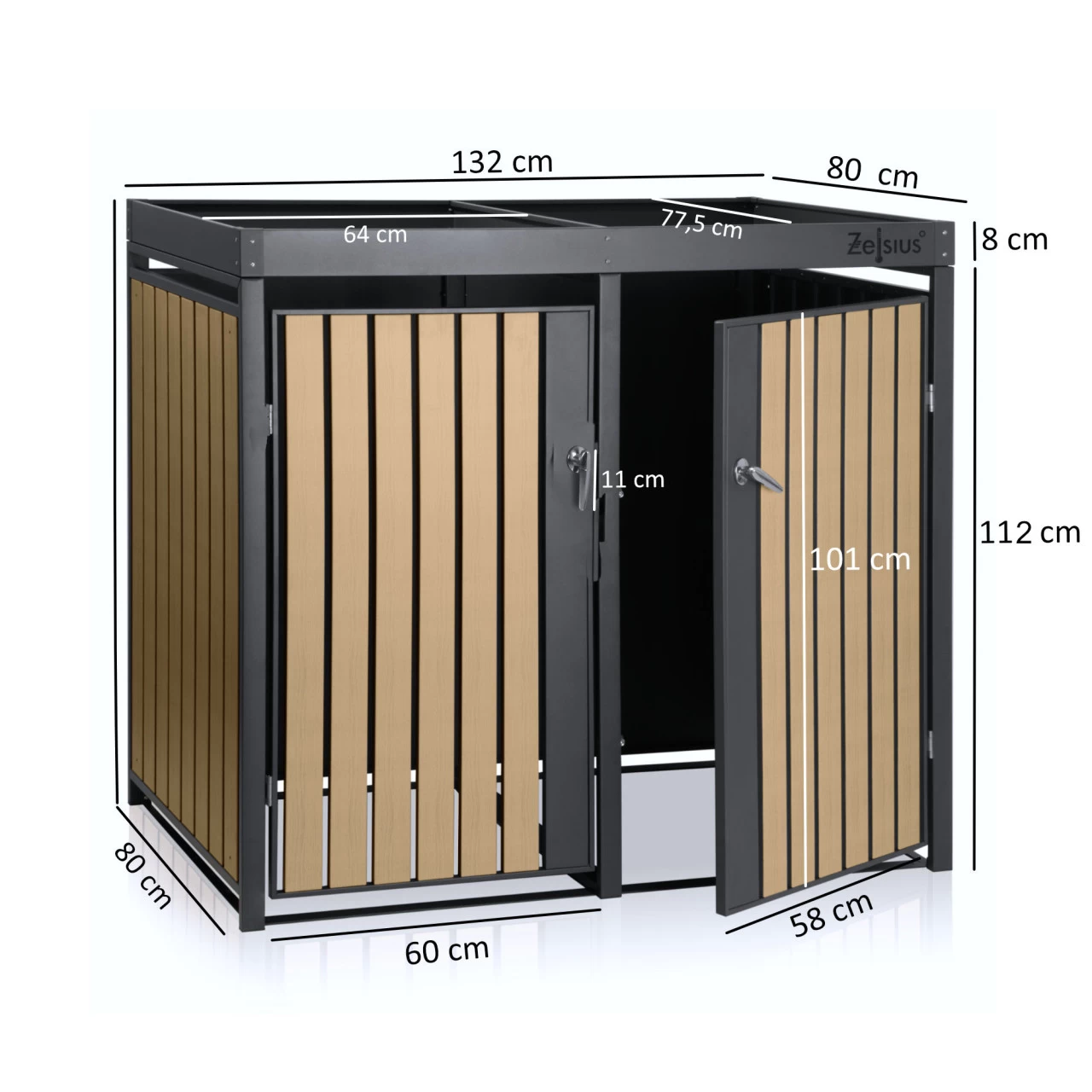 Unser Zelsius Mülltonnenkasten bietet Platz für zwei 120 – 240 l Tonnen und wertet nebenbei durch das moderne Holzdekor Ihre Hauseinfahrt optisch auf. Das Dach der Müllbox kann begrünt werden und ist somit ein echter Hingucker an Ihrem Haus.