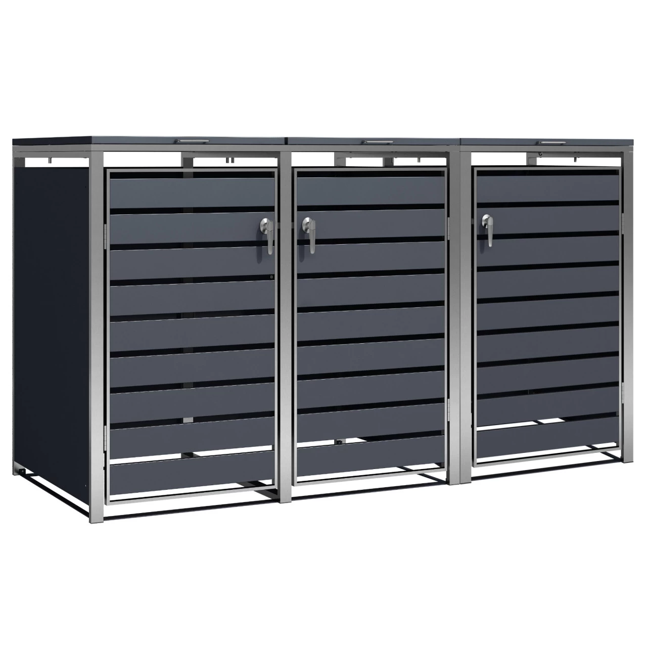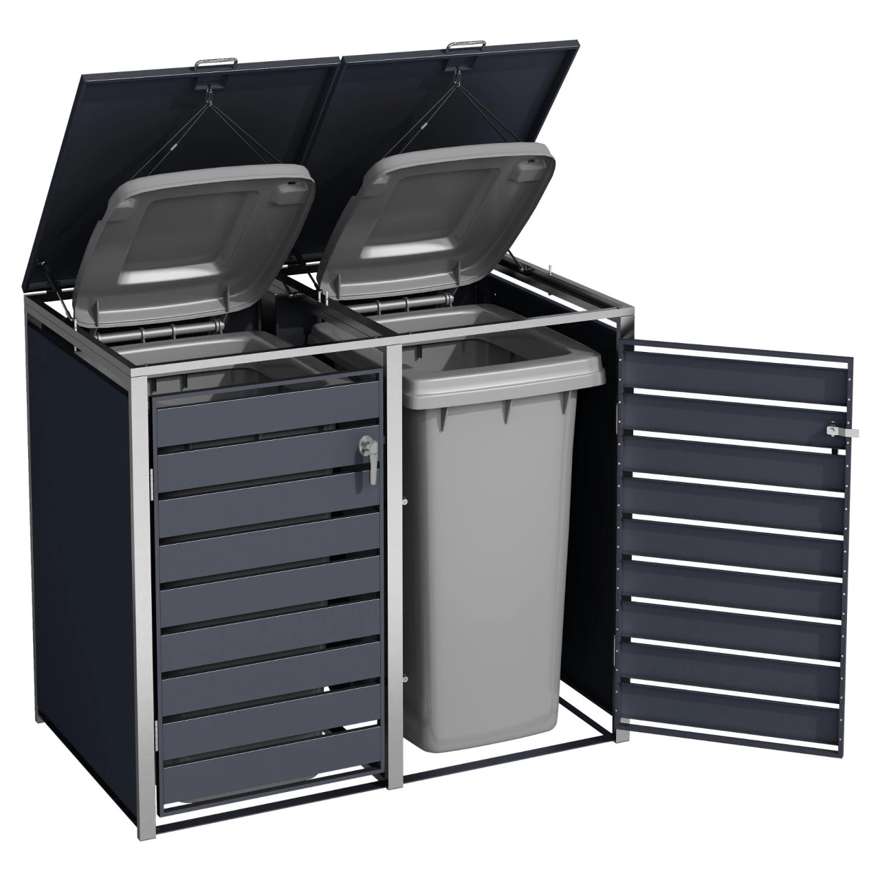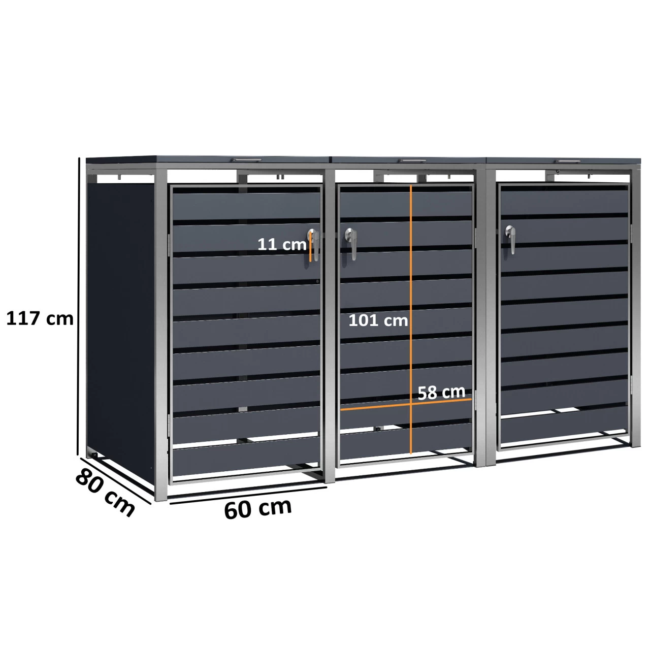 Die Müllboxen sind aus hochwertigem verzinktem Stahl und der Rahmen der Box aus Edelstahl hergestellt und dadurch robust und langlebig. Die Schlitze in der Tür sorgen für eine gute Belüftung und ein zeitloses Design. Die Boxen verdecken und schützen die Müllcontainer in Ihrem Garten und schaffen somit eine saubere und gleichzeitig schöne Umgebung.