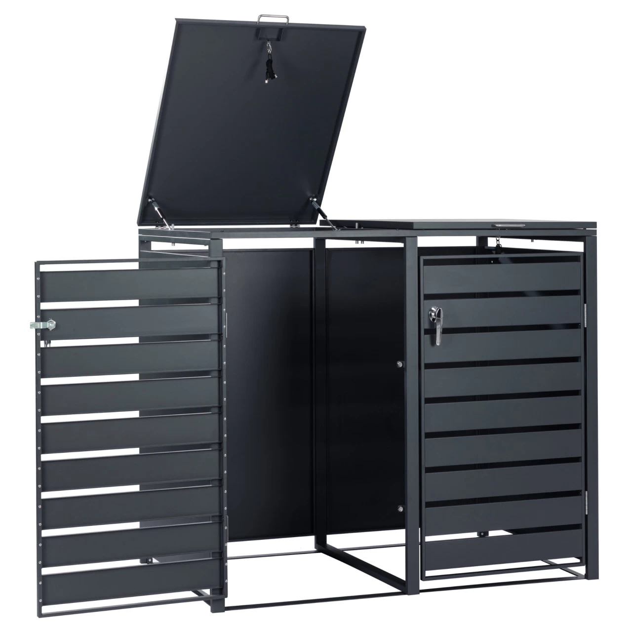 An den Fronttüren der Box befindet sich ein 11 cm großer Griff, der das Öffnen und Schließen der Tür erleichtert. Zusätzlich befindet sich im Lieferumfang eine Schnur, mit der Sie den Deckel Ihrer Mülltonne einfach an dem Deckel der Müllbox befestigen können. Dadurch werden beim Öffnen automatisch beide Deckel zusammen geöffnet.