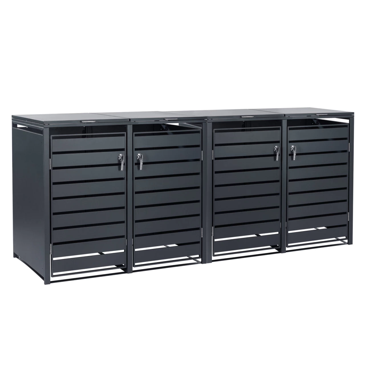 Die Müllboxen sind aus hochwertigem verzinktem Stahl hergestellt und dadurch robust und langlebig. Die Schlitze in der Tür sorgen für eine gute Belüftung und ein zeitloses Design. Die Boxen verdecken und schützen die Müllcontainer in Ihrem Garten und schaffen somit eine saubere und gleichzeitig schöne Umgebung.