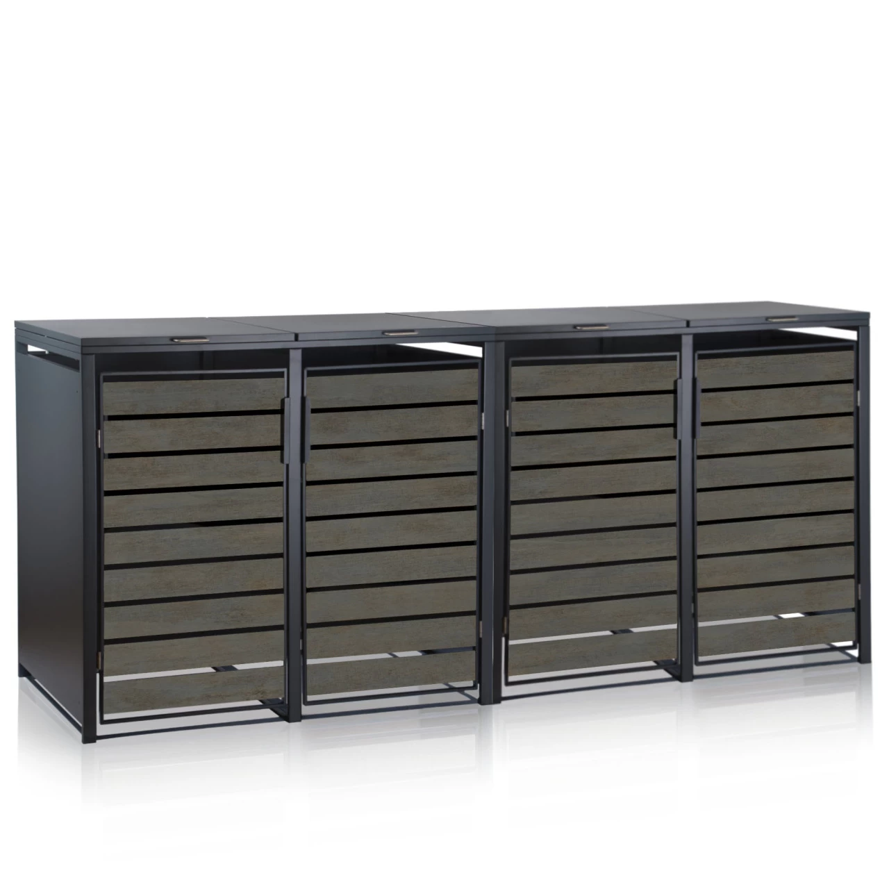 HINWEIS: Im Freien wird die Farbe der Mülltonnenbox stark durch das natürliche Licht beeinflusst und es kommt zu Reflexionen von Braun- und Grautönen, die bis in eine grünliche Farbdarstellung reichen können.