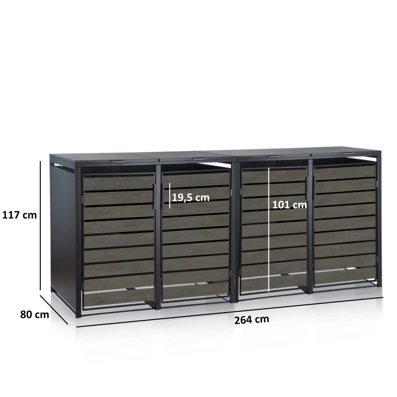 Unser Zelsius Mülltonnenkasten-Set beinhaltet zwei Doppelboxen. Dadurch bietet das Set Platz für bis zu vier 120 – 240 Liter Tonnen und wertet nebenbei durch das ansprechende Design Ihre Hauseinfahrt optisch auf. Die Vorderseite der Türen glänzen in einem ansprechenden Holzdesign.