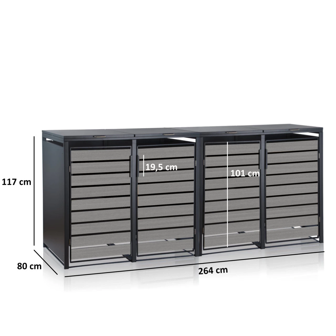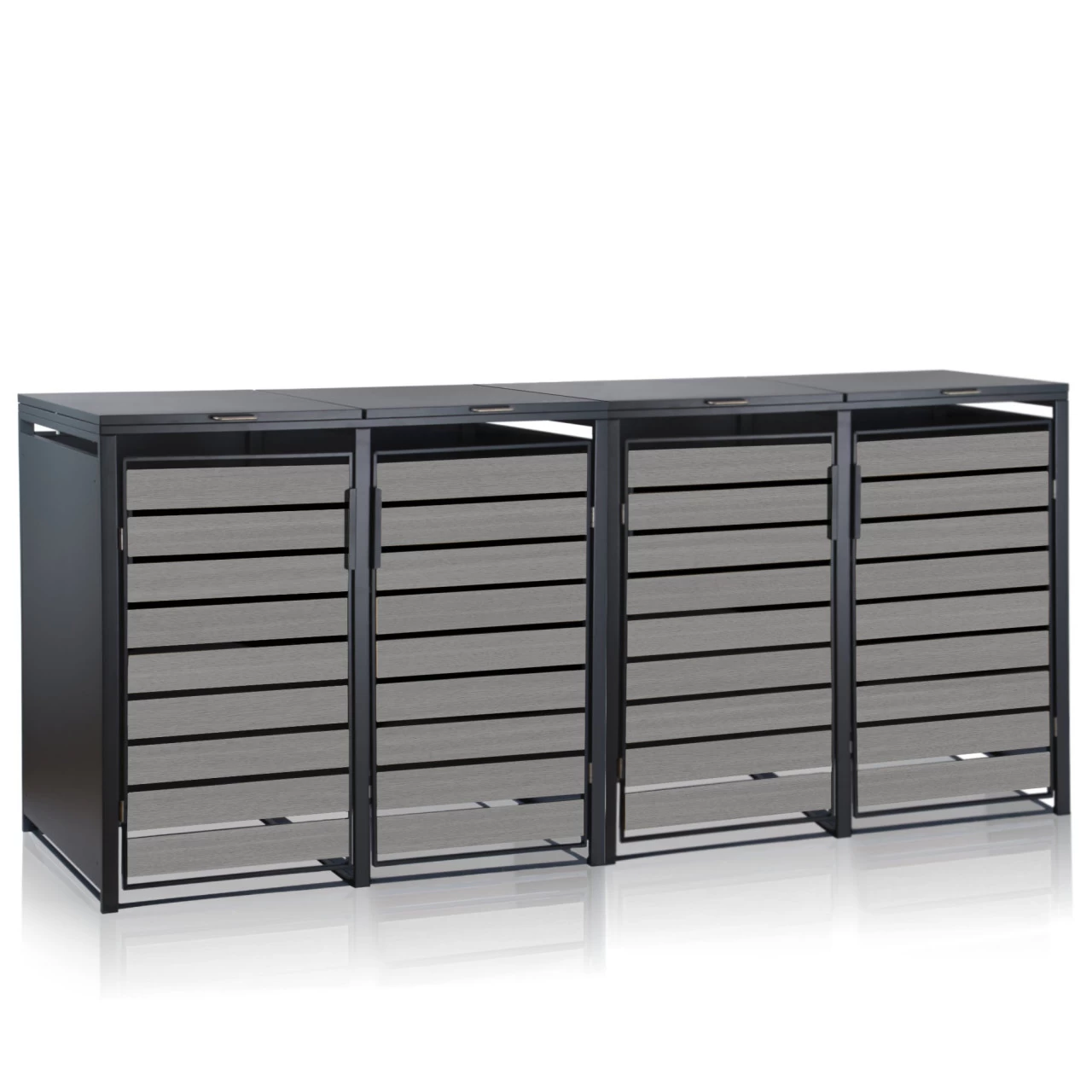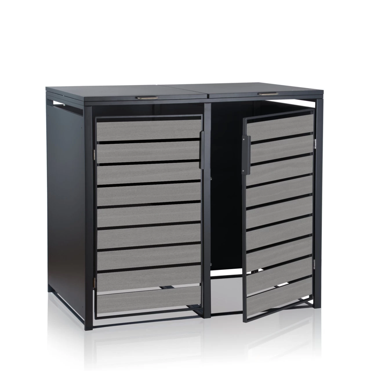 Die Müllboxen sind aus hochwertigem verzinktem Stahl hergestellt und dadurch robust und langlebig. Die Schlitze in der Tür sorgen für eine gute Belüftung und ein zeitloses Design. Die Boxen verdecken und schützen die Müllcontainer in Ihrem Garten und schaffen somit eine saubere und gleichzeitig schöne Umgebung.