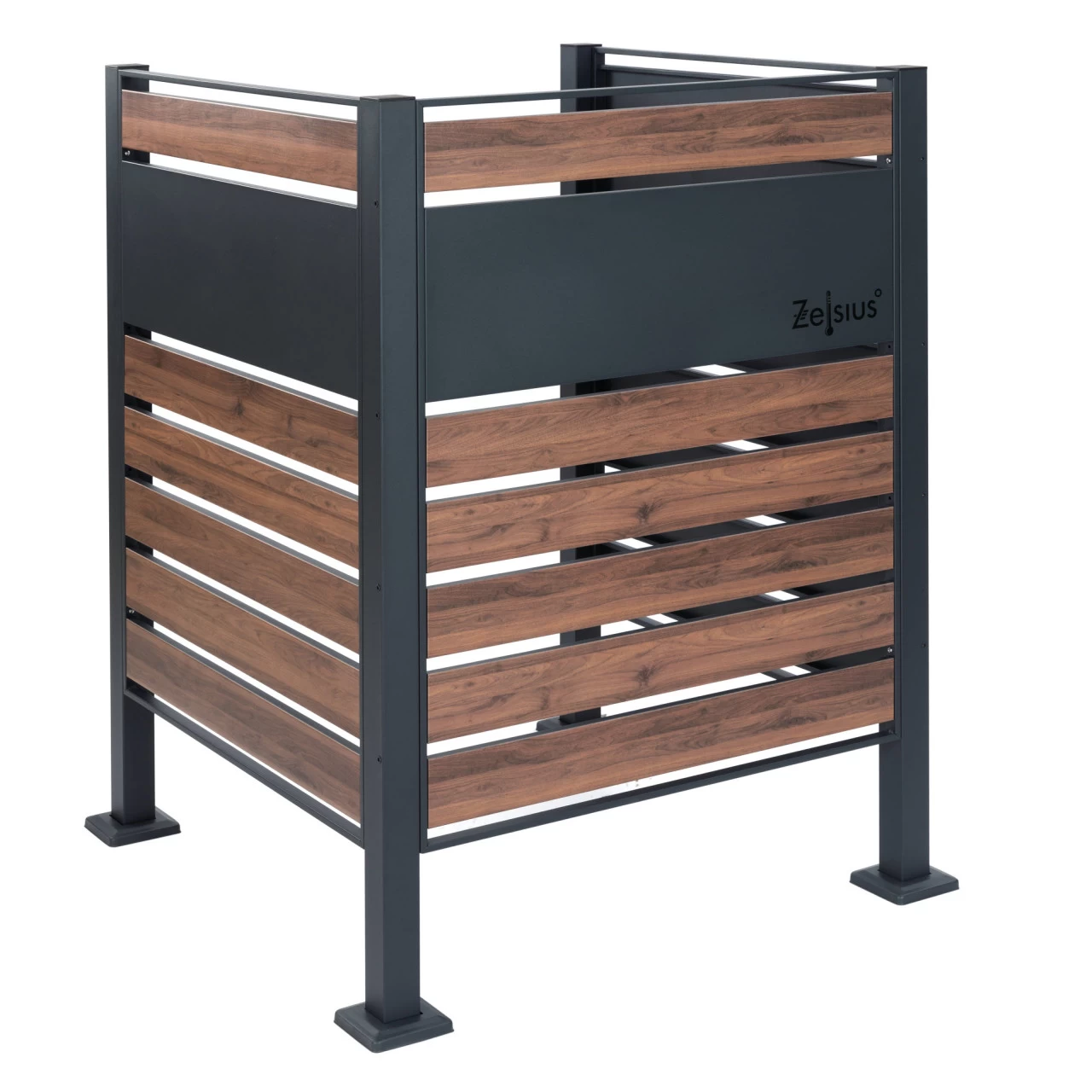 Unsere Zelsius Mülltonnenverkleidung bietet Platz für eine 120 – 240 Liter Tonne und wertet nebenbei durch das ansprechende Design Ihre Hauseinfahrt optisch auf. Die Zaunelemente glänzen in einem ansprechenden Holzdesign.