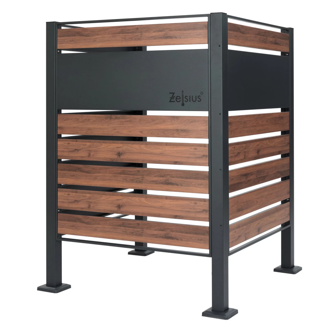 Unsere Zelsius Mülltonnenverkleidung mit Erweiterung bietet Platz für zwei 120 – 240 Liter Tonnen und wertet nebenbei durch das ansprechende Design Ihre Hauseinfahrt optisch auf. Die Zaunelemente glänzen in einem ansprechenden Holzdesign.