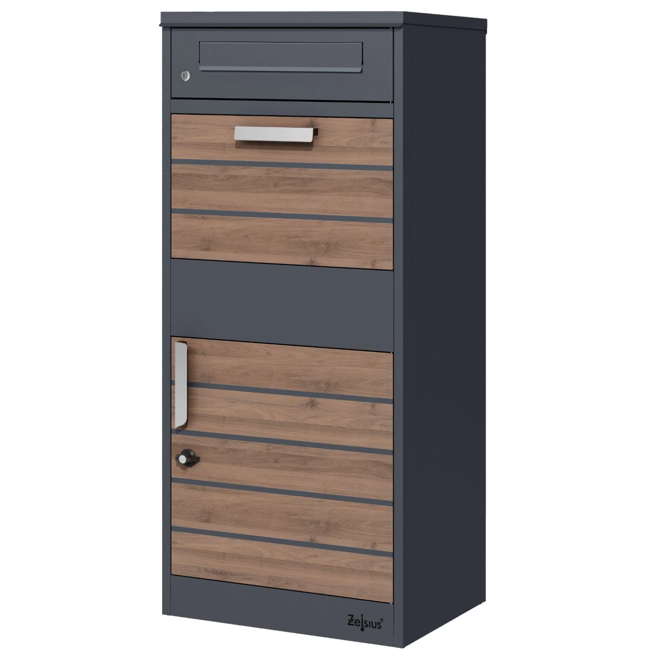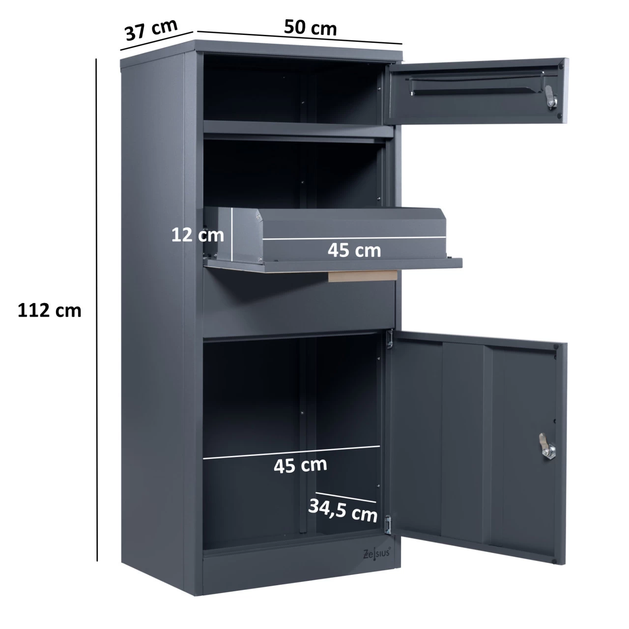 Der Paketkasten besteht aus hochwertigem verzinktem und pulverbeschichtetem Stahl, welcher Ihren Paketkasten langlebig und standhaft gegen Wind- und Wettereinflüsse hält.