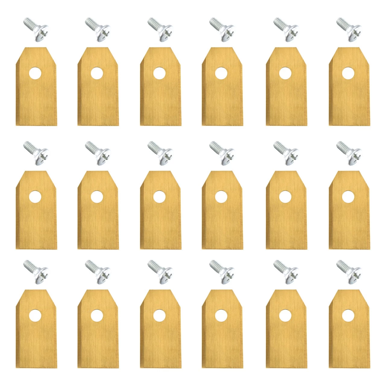 Mit einer Größe von 35 x 18 mm und einer Dicke von 0,75 mm sind die Roboter Klingen für 200 – 250 Mähstunden (pro Messer) geeignet. Die extra gehärtete Titan Schneidklinge wird mit passenden Carbonstahl Schrauben geliefert.