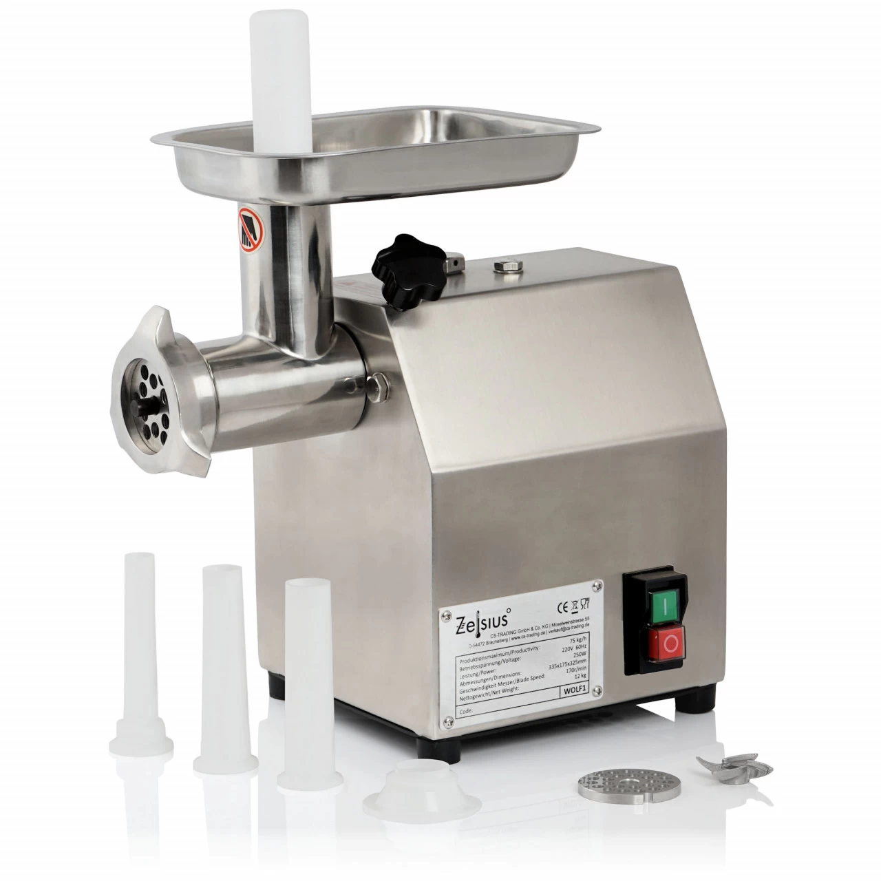 Mithilfe des elektrischen Fleischwolfs können Sie im Handumdrehen 75 kg Fleisch pro Stunde in Hackfleisch zerkleinern. Mit den zwei verschiedenen Lochplatten kann das Fleisch in feine und grobe Fleischmasse gewolft werden.