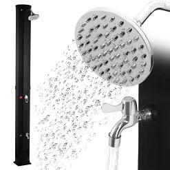 Für die optimale Abkühlung sorgt der große Regenduschkopf. Dank des integrierten Kugelgelenks lässt sich der Duschkopf der Solar Gartendusche für Außen um 180° drehen und leicht einstellen. Eine zusätzliche Fußdusche mit Wasserhahn sorgt für Erfrischung bei jeder Gelegenheit.