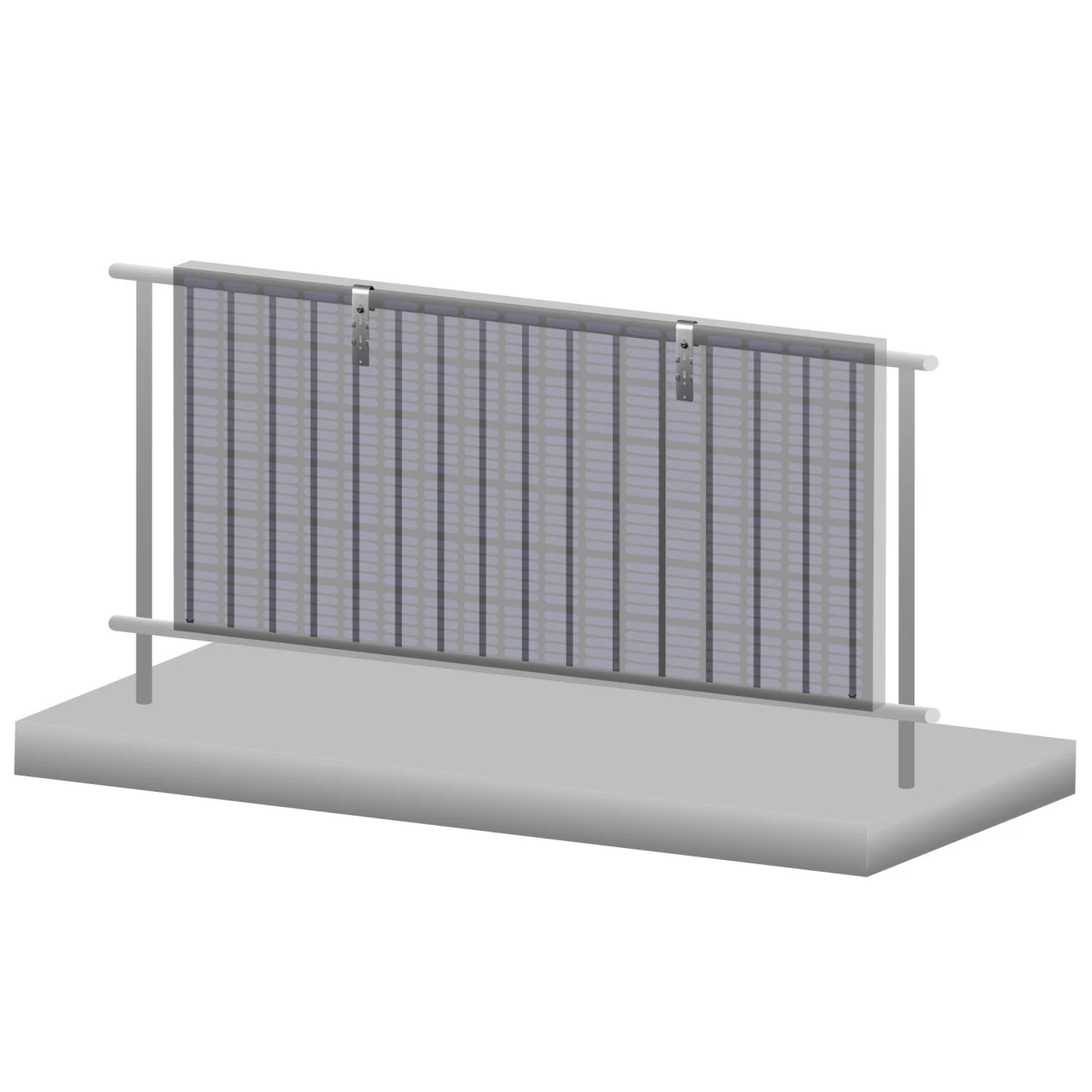 Die Solarmodule lassen sich mithilfe der mitgelieferten Stahlseile sicher fixieren. Durch stufenlosen Befestigungschrauben sind die Stahlseile sowohl an dünne als auch an dickere Geländerstäben anpassbar, wodurch sich die Panele sicher befestigen lassen. Die Halterung ist für Balkone mit Handläufen, die eine Mindestbreite von 3,5 cm aufweisen, geeignet.