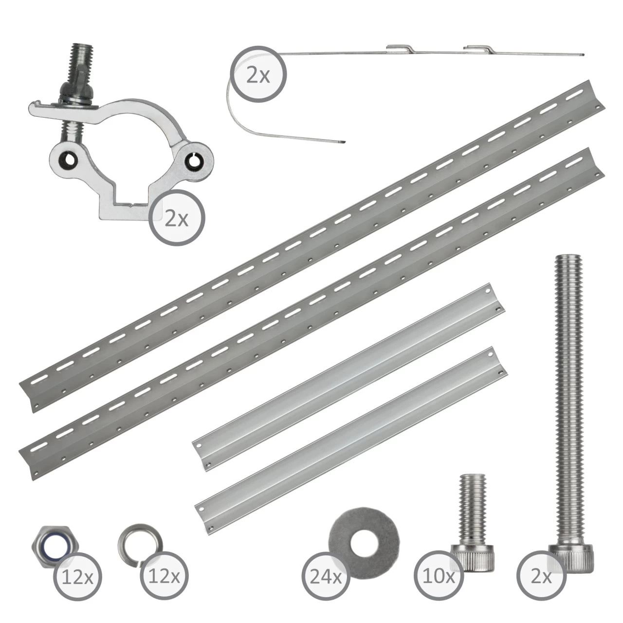 – Lieferumfang: 2x Befestigungsstange, 2x Stützstange, 2x Befestigungshaken, 2x Befestigungsklemme, Montagematerial