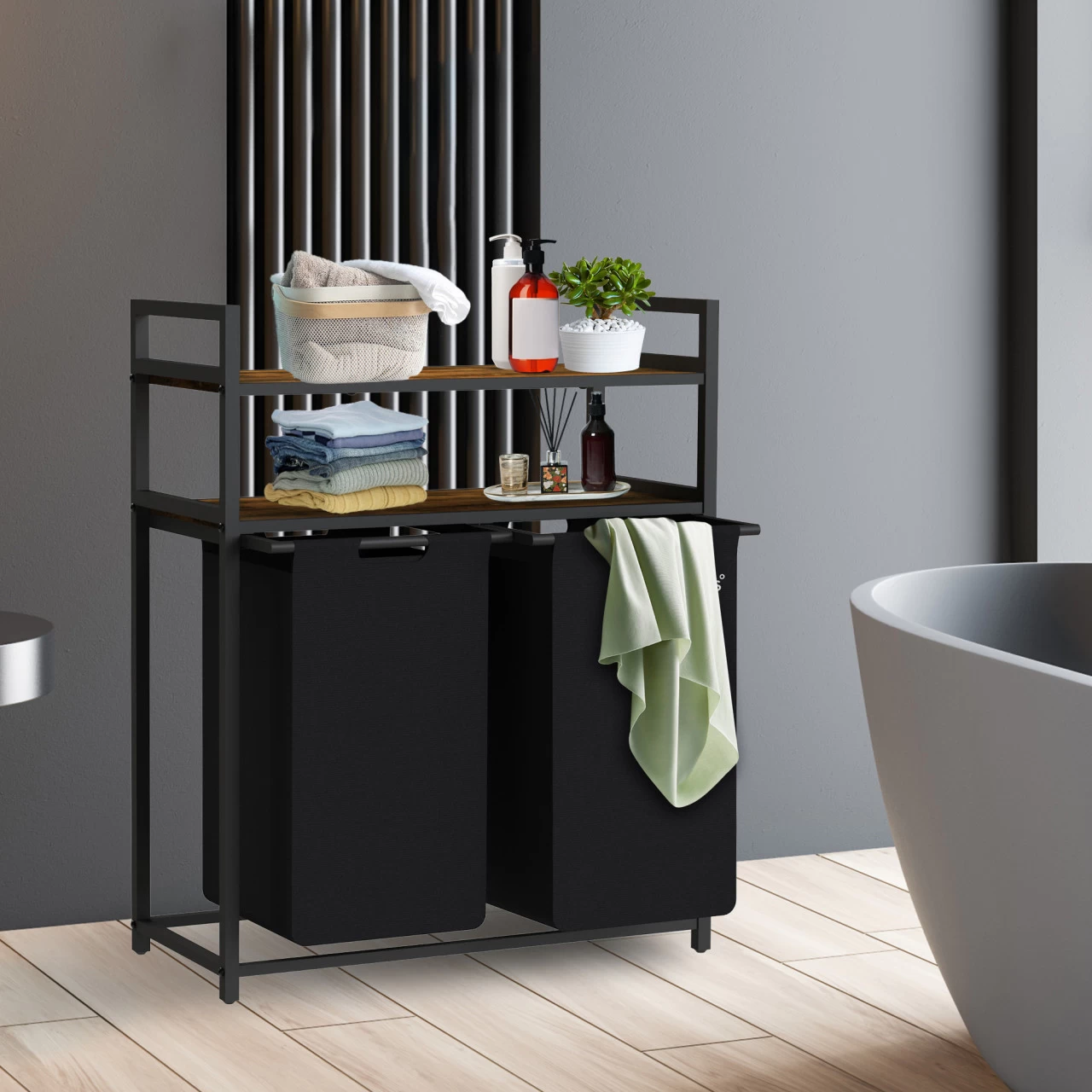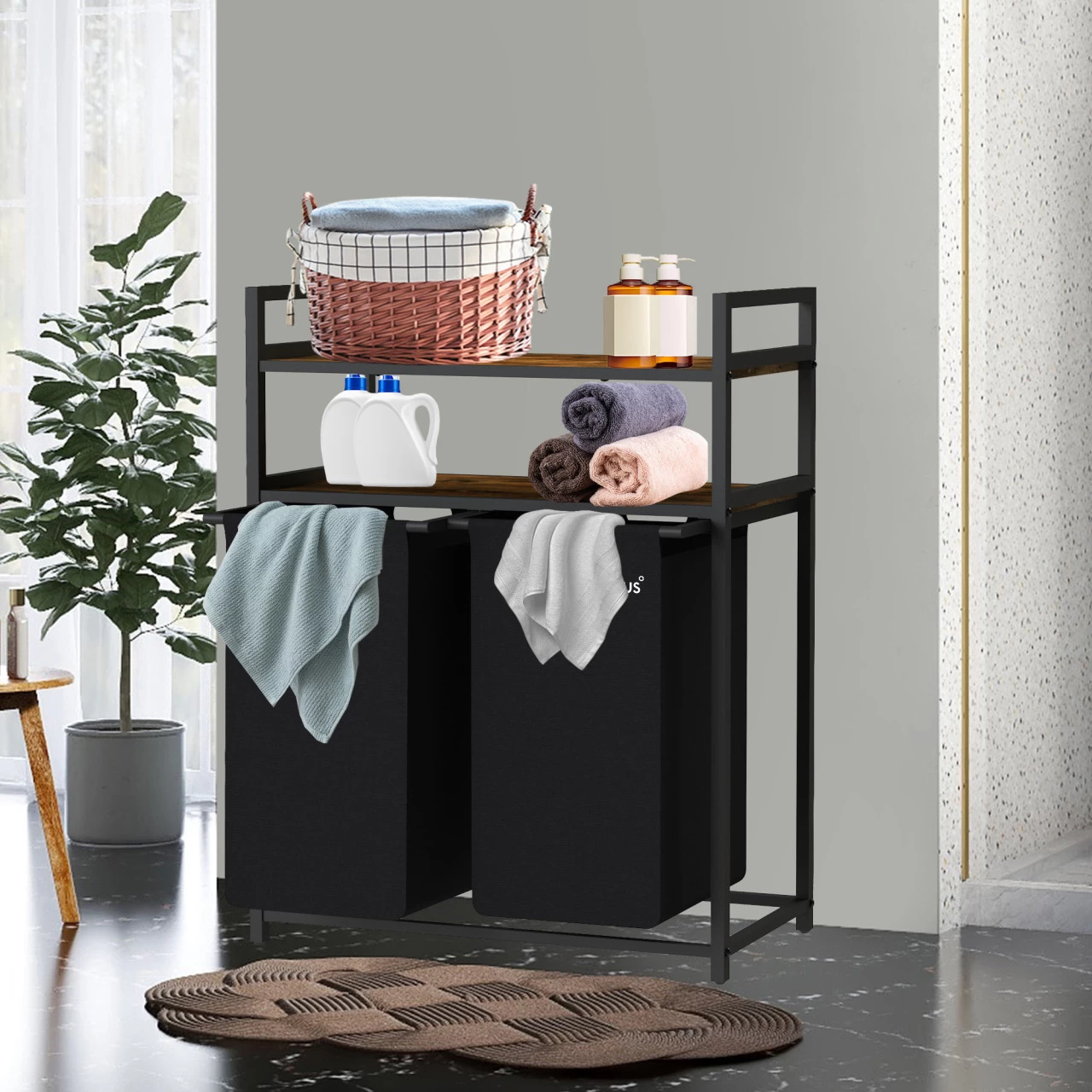 Oberhalb der beiden Wäschebeutel befinden sich zwei robuste Ablagen in Holzoptik, diese besitzt eine Traglast von je 20 kg und bietet zusätzlichen Platz für Waschmittel, Handtücher, Toilettenartikel und vieles mehr. Jeder Wäschesack besitzt ein praktisches Fassungsvermögen von ca. 44 Litern.
