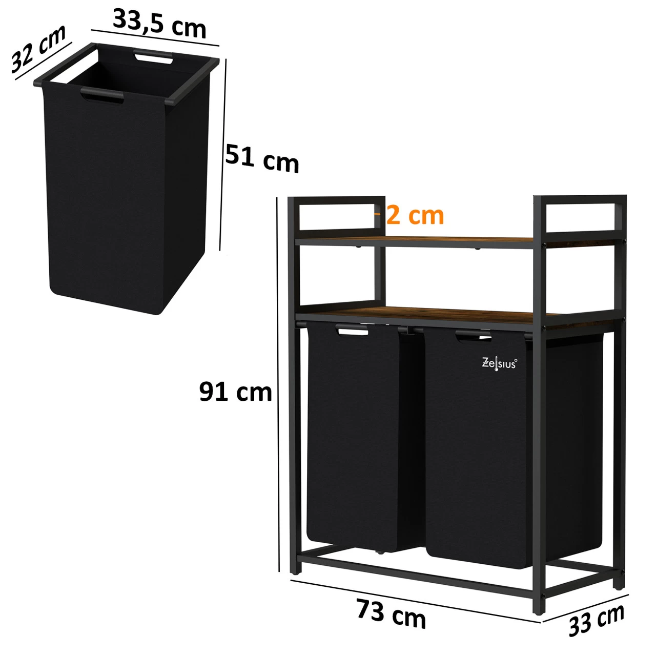 Der Zelsius Wäschesammler mit Ablage ist die ideale Ergänzung für Ihr Badezimmer, Ankleidezimmer oder Schlafzimmer. Dank der beiden ausziehbaren Behälter können Sie schmutzige Kleidung, Bettwäsche und andere Textilien separat sortieren und aufbewahren.